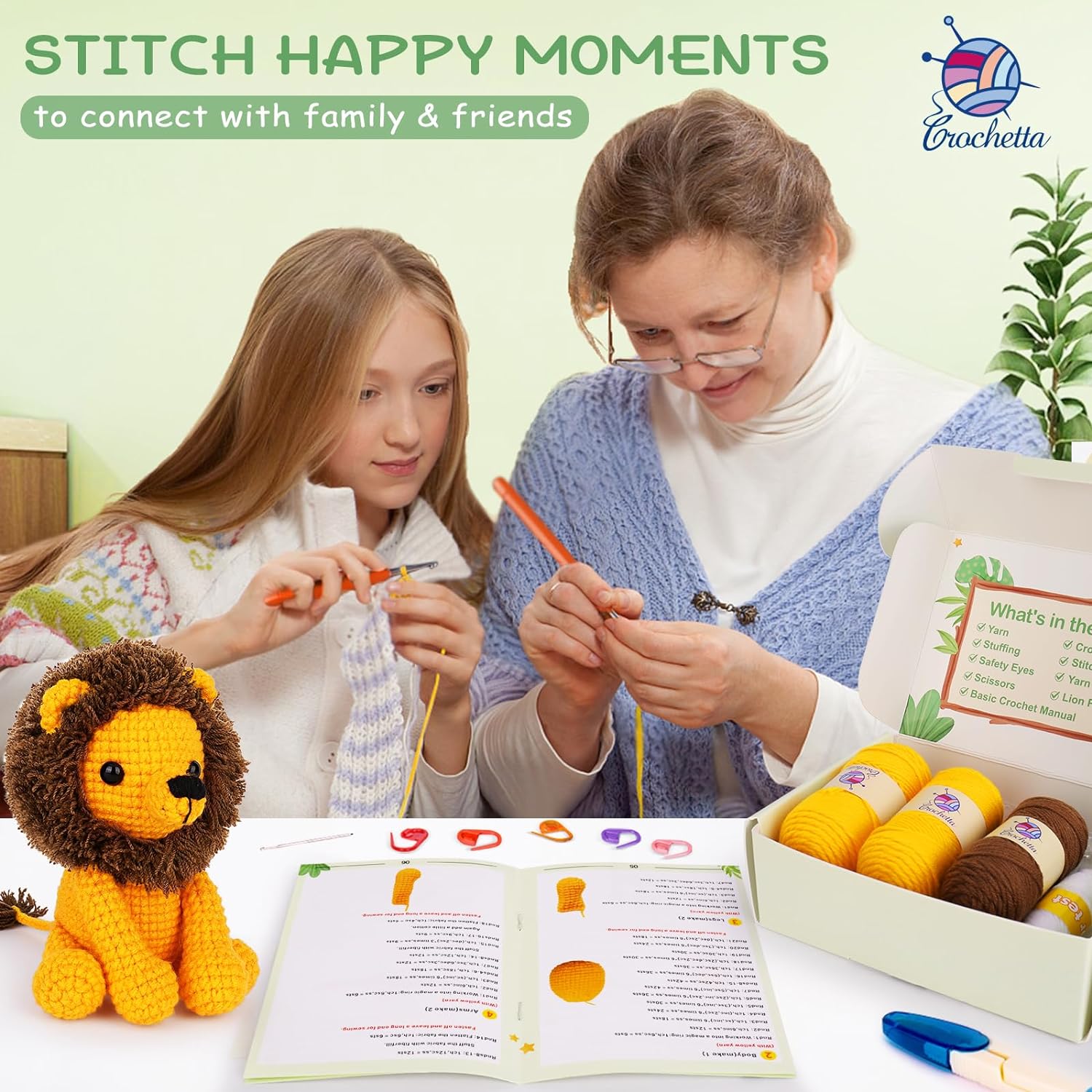 All-In-One Crochet Starter Kit: CROCHETTA beginner crochet kit includes everything you need to start: 8 different colored yarns, ample stuffing, 1 needle, 6 eyes, 5 stitch markers, 2 ergonomic crochet hooks, 1 pair of scissors, 1 crochet Mini Animals pattern manual, and 1 beginner’s basic crochet manual.