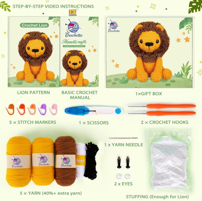 Crochet Kit for Beginners, Crochet Starter Kit with Step-by-Step Video Tutorials, Crochet Animal Kits for Adults Kids, DIY Craft Supplies (Lion)