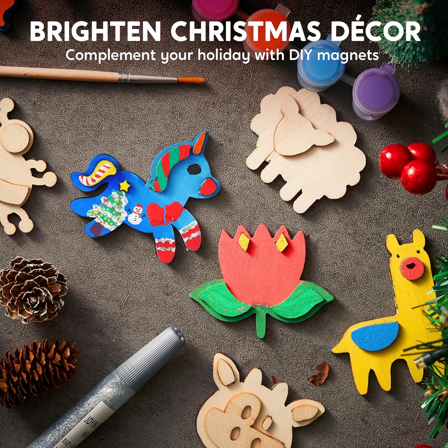 COMPREHENSIVE SET. Our DIY Creativity Art Supplies Kit includes 12 wood magnets, a paint palette, a brush, a glitter glue. The instruction sheet is included.