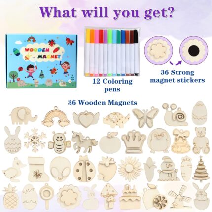 Worgree DIY Wooden Magnets, 36 pcs Wooden Art Craft Supplies Painting Kit for Kids Party Favors for Boys Girls Ages 4-8 8-12 Birthday Easter Crafts Gifts Toys Basket Goodie Bag Stuffers